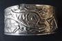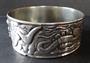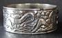 Obecný kov, stříbro, kámen - tygří oko. Ve tvaru kruhu. Tepaný vrchní stříbrný plech s reliéfním námětem mořské panny, mořského koníka, delfína a racka. Na jedné straně vložené tři tygří kamínky nad sebou. Spodní část náramku z obecného kovu. Ryzost stříbra AG 980 / 1000, čistá hmotnost 10 gramů. Celková hmotnost 41,70 gramů. Evropa, minulé století. Průměr 7 cm.