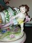 Porcelánový nastolec ve tvaru vozu taženeho andělem. Rozměr délka 40cm, šířka 23cm, výška 46cm. Bez poškození.