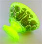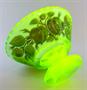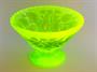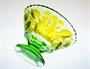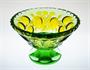 Luxusní nástolec - masivní mísa na noze z uranového skla (odstín Eleonoren-Grün) s velmi výrazným luminiscenčním efektem. Sklo je zušlechtěné hluboce rytým dekorem "Plody léta", který je zvýrazněn žlutou (citrínovou) lazurou. Spodní a vrchní část je broušená do fazet. Práce z první poloviny minulého století, dobrý stav, rozměr - v. 13,5cm, prům. 21cm