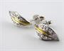 Bílé a žluté 18 karátové zlato, přírodní diamanty. Ryzost Au 750 / 1000, celková hmotnost 2,45 gramů. Přírodní diamanty moderního briliantového brusu a výbrusu Achtkant, o celkové váze cca 0,20 ct, barva G - H, čistota Si. Jedna náušnice osázená přírodními diamanty jednoduššího brusu Achtkant, druhá náušnice osázená 3 přírodními diamanty moderního briliantové brusu a 6 přírodními diamanty brusu Achtkant. Náušnice klenutého tvaru listu z bílého zlata a řapíku listu ze žlutého zlata, osázené 18 přírodními diamanty různého brusu. Zapínání náušnic na puzety. Značeno : československý punc hlava kohouta s číslem 3. Evropa druhá polovina minulého století. Výška 15 mm.