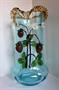 Váza ze světle modrého skla, s optickými žebry, foukaná do formy, v dolní části břichatě rozšířená, na nízké patce, ústí vázy zastřiženo, s nasazenými žlutými lipnami s barokním mačkaným okrajem, tělo s nataveným barokářským dekorem jahod, s bílými květy, plody s červenými zrnky, fialovými stonky a zelenými listy. Dno zabroušeno. Výška 44 cm, horní průměr 17 cm, průměr břicha 23 cm. Dno a jeden lístek (foto detail) uštípnuty. Výrobce a autor neurčeni. Možná produkce sklárna Johann Lötz Witwe, Klášterský Mlýn (Klostermühle), tvar upomíná střih s jahodami č. 873 produkce na zakázku pro firmu Ignaz Lösel, Česká Kamenice 1873-1882. Kol 1880. Lit.: Lötz, Böhmisches Glas 1880-1940, Band 2, Katalog der Musterschnitte, Hrsg. Helmut Riecke ..., Bearb. Jan Mergl, Duňa Panenková, 1989 Prestel Verlag, München, Kunstmuseum Düsseldorf, Ernst Ploil, Wien, str. 266 a 533.
