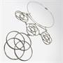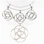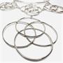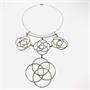 Nepřehlédnutelný, autorský, velmi efektní, celostříbrný náhrdelník. Vyroben ze stříbra ryzosti 925/1000, o celkové váze 38,5 g. Šperku dominuje grandiózní ověs s geometrizujícími, navzájem propletenými kruhy. Jedná se o ateliérový šperk, nikoliv sériovou výrobu. Perfektní stav, profesionálně vyčištěno.