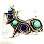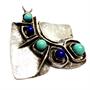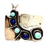 Nevšedně pojatá originálně ztvárněná brož - motýl. Šperk byl zhotoven ze sterlingového stříbra (925/1000), o celkové váze 17,45 g. Zdobeno lápisy lazuli a tyrkysy. Rozměry 4 x 3,5 cm. Autorská signatura. Perfektní stav.