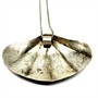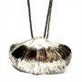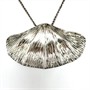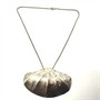 Originální stříbrný náhrdelník s grandiózním , odnímatelným závěsem znázorňujícím mušli. Hladký, nevšední, splétaný řetízek vyroben ze stříbra ryzosti 750/1000. Šperku vévodí velký závěs mušle. Ten byl nevšedně zhotoven z téměř ryzího stříbra (959/1000). Celková váha šperku 23,31 g. Délka řetízku 41cm, rozměry závěsu cca 7 x 4 cm. Výborný stav.
