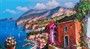 Motív: výhľad z terasy na more – typické farebné domy a kvety v štýle Sorrenta
