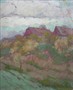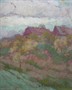Olej na kartonu 31 cm x 27 cm. Signováno vpravo dole. V secesním stylu. Autor: Otakar Hůrka (1889-1966). Venkovské návrší se starými chalupami, ovocným sadem a malými políčky za oblačného dne pojaté v secesním duchu. V novodobějším úzkém hnědém rámu se sklem. Čechy 1910 - 1925. Celkový rozměr s rámem 33 cm x 29 cm.