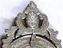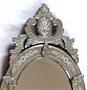 Bezbarvé broušené sklo, dřevo, kov. V benátském stylu. Zrcadlo oválného tvaru s vnitřní fazetou. Na okraji po jeho obvodu zbořené broušeným rostlinným ornamentem. Ozdobný horní štít v rokokovém stylu a rozvilinami. Spodní ozdobná samostatná část. Broušené úchyty florálního tvaru. Místy stopy opotřebení. Československo minulé století. Výška 77 cm, šířka 41 cm.