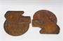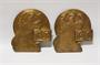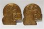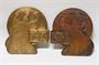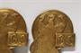 Pár secesních medailonů s hlubokým reliéfem na mosazném plechu, původně snad na vstupní dveře domu, nebo jako součást zakázkového nábytku. Výrazné secesní tvarosloví s motivem tří pávů a monogramem majitele. Velmi líbivá uměleckořemeslná práce z prolisovaného mosazného plechu z počátku minulého století. Výrobcem neznačeno, na rubové straně dvě spony na uchycení. Rozměr - v. 30 x 27 x 1,5cm