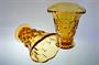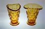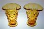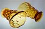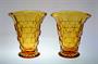 Párové vázy otevřeného vějířovitého tvaru z ambrového skla s kubistickým ornamentem po celé ploše. Stylové ručně lisovaného sklo s výrazně vystouplým reliéfem. Pravděpodobně provedla sklárna Josef INWALD Teplice v první třetině minulého století. Dobrý stav, rozměr - v. 16cm, prům. 14cm