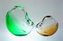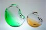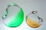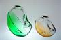 Masivní hutní autorské sklo, pár barevných váz v kombinaci s čirým sklem a hutním vpichem. Čiré sklo je navrstvené ambrovou a zelenou ( Oceanit ) sklovinou. Autorem je sklářský výtvarník a pedagog Karel WÜNSCH ( *1932 ). Jeho tvorba je zastoupena v mnoha našich i zahraničních sbírkách, je také autorem návrhů skla a keramiky pro horský hotel a vysílač Ještěd. Vázy pochází z období kolem roku 1975 provedla sklárna Ústředí uměleckých řemesel Škrdlovice. Dobrý stav, rozměr v. 21 x 19 x 9cm a v. 14 x 14 x 7cm