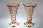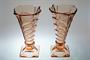 Stylové vázy z rosalínového ručně lisovaného skla stojící elegantně na patce. Párové vázy ve výrazném tvarosloví ART - DECO mají tvar otevřeného květu s hlubokým reliéfem. Autorem návrhu je sklářský výtvarník Rudolf SCHRÖTER ( *1887 ) a provedla sklárna Josef INWALD Teplice ve 30tých letech minulého století. Dobrý stav, rozměr - v. 21cm, prům. 12cm