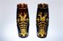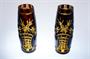 Vázy z masivního vrstveného skla s ambrovým jádrem, které je přejímané rubínovou sklovinou a následně bohatě dekorované probrušovaným ornamentem, paradoxně s motivem květin ve váze. Jedinečně dochované párové vázy ze 30tých let minulého století ve stylu ART - DECO. Krásná prvorepubliková práce sklářů a brusičů skla. Dobrý stav, rozměr - v. 20,5cm, prům. 8cm