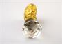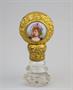 rukojeť ze zlacené mosazi, na porcelánovém medailonku malovaný dívčí portrét, na pečetním typáři z horského křišťálu rytá parafráze biblického motivu, kdy Evina ruka trhá jablko ze zakázaného stromu s hadem pokušitelem; střední Evropa, kolem r. 1860, výška 6,5 cm; sběratelsky zajímavé