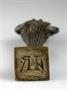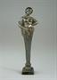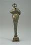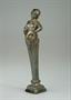 secesní figurální pečetidlo z obecného kovu s patinou, žena se srpem a s obilnými klasy symbolizuje úrodnost a můžeme ji vnímat jako parafrází římské bohyně plodnosti a úrody Ceres, resp. řecké bohyně Démétér (bohyně plodnosti a rolnictví), raznice (pečetní hlava) s iniciálami A. R., Německo, kolem r. 1905; výška 12,5 cm