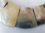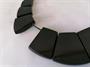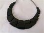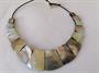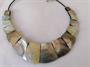Zajímavý náhrdelník z článků, jejichž vrchní část je z perleti, ta je podložena černým plastem patrně ebonitem, články jsou navlečeny na pevné tkanici, uzávěr tvoří perleťový knoflík, celková délka 46 cm.