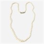 Velice elegantní náhrdelník se šňůry přírodních kultivovaných smetanově bílých perel, ty jsou skládány stupňovitě od středu, jejich průměr je 7-3 mm, vynikají svou kulatostí a velmi dobrou kvalitou. Oválné art-deco zapínání osazeno perlou stejných kvalit, zdobeno technikou zrnkování (milgrain) a prořezáváno, frontální část z bílého, spodní ze žlutého zlata. Vkusný, tradiční šperk vhodný k dennímu nošení i večerní příležitosti, západoevropská práce z 20. až 30. let 20. století.