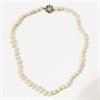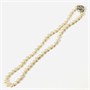 Koncové kroužky z bílého 14 karátového zlata, tj. o ryzosti 585/1000, zapínání z nezlaceného stříbra o ryzosti 835/1000; ryzostní číslo zespod zapínání. Hmotnost 27,26 g, délka 44,5 cm, průměr zapínání 15 mm. Nově převlečeno, perly jsou mezi sebou pečlivě uzlíkovány. Zapínání v pořádku, celkově v zachovalém stavu.