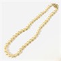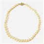 Výrazný náhrdelník se šňůry přírodních kultivovaných smetanově bílých mořských perel, které vynikají svou mírnou organickou asymterií, leskem a větším průměrem 8-9 mm. Zapínání ve tvaru stylizovaného prořezávaného pletence, oboustranně osazeno přírodními diamanty kulatého jednoduchého brusu o celkové cca váze 0,54 ct (0,015 ct - 36 ks). Vkusný, tradiční šperk vhodný k dennímu nošení i večerní příležitosti, západoevropská práce z 50. až 80. let 20. století.