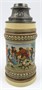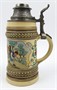Tvrdá světlá glazovaná kamenina, ruční malba, cín. Pivní korbel z tvrdé kameniny se světlou glazurou a ruční malbou zobrazující vesnickou pijatiku doprovázenou hrou v kuželky a muzicírováním pod širým nebem. Dekor korbelu doplněn o reliéfní florální věnečky, vlnovky a punktování. Velmi pěkné zdobné víko a úchyt korbelu s palmetami. Ve výborném stavu. Značeno zespodu: čísly. Německo 1890 - 1930. Výška 24 cm.
