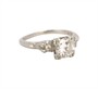 Prsten z platiny ryzosti 900/1000 zdobí centrální velmi kvalitní diamant starého briliantového brusu hmotnosti 0,95 ct - čistoty VS, barvy G-H a po stranách čtyři drobnější brilianty celkové hmotnosti 0,08 ct. Hmotnost prstenu 4,04 g, velikost 53. K dispozici certifikát s potvrzením gemologa.