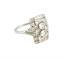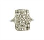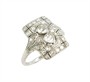 Starožitný prsten typický pro období art deco byl zhotoven před sto lety z platiny ryzosti 950/1000. Jemně prořezávanou obdélníkovou hlavu zdobí diamanty briliantového brusu celkové hmotnosti cca 0,32 ct. Velikost prstenu 53, celková hmotnost 4,70 g. Prsten je ve velmi dobrém stavu a vyčištěn.