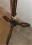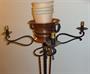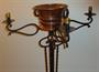Podlahová,kovová lampa,žárovky jsou potřeba bajonetové,širmy jsou s drátěnou smyčkou nasazovací na žárovku,na středové,horní plošině je umístěna tepaná,měděná nádoba,velmi zachovalá,výška bez širmů 153 cm.