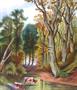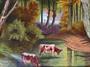 Olej na plátně 78x68 cm. Signováno vlevo dole monogramem G. P. datováno 31. 1888. V romantickém stylu. Ústřední motiv pijící dvojice býků či volků z mělké říčky v listnatém lese. V pozadí mezi stromy prosvítá usedlost. Originální zlatý zdobený dekorativní rám. Střední Evropa rok 1888. Celkový rozměr s rámem 95x85 cm
