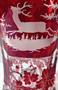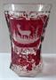 Sklo bezbarvé, broušené a ryté, rubínová lazura. Válcovitého tvaru, se zkosenými hranami. V horní části, tři reliéfní medailony s jelen, laní a psem, ryté na rubínové lazuře. V dolní části zdobená malovaným rubínovým motivem. vinné révy s hrozny. Biedermeier, Střední Evropa 1840 - 1860. Výška 13 cm, šířka 9 cm.