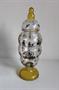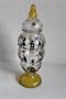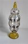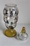 Pohár článkovitý, na duté patce, s víčkem. Čiré sklo, patka a víko žluté lazurované, s malbou švarclotem na zlatém podkladě, zlacený horní okraj. Sklářská škola Kamenický Šenov (Fachschule Steinschönau). Dekor Adolf Beckert. Kol 1915/20. Výška 22 cm, patka průměr 6,6 cm, hrdlo průměr 5 cm.