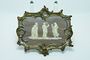 Plaketa z porcelánu imitující kamej na ušlechtilém polodrahokamu, tři ženy s atributy jako symboly medicíny a léčitelství z počátku minulého století. Elegantním lemování patinovaným ornamentem. Porcelán z PASSAU ( PASOV ) Německo. Perfektní stav bez poškození, rozměr š. 15,5 x 14,5 x 1,5cm
