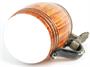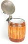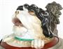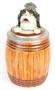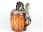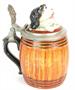 Porcelánový půllitr vyrobený v Německu kolem 1. poloviny 19. století. Průsvitka s vlasovými prasklinami. Rámeček víka cínový. Plastika hlavy psa.