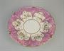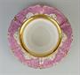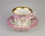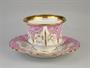 porcelánový šálek s podšálkem, malovaný růžový a zlacený květinový dekor, Dalovice, Čechy kolem roku 1850, značeno; výška šálku 6,5 cm, průměr podšálku 16 cm