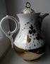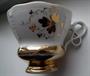 Porcelánový servis - 6x šálek, 6x podšálek, mísa, konvice s víčkem. Značeno podglazurně KPM. Značka používaná v letech 1840 - 1895. Výška konvice 23 cm, průměr mísy 28 cm. Nepoškozeno, pouze místy setřeno zlacení - viz foto.