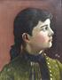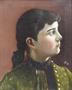 Olej na plátně 25,5 cm x 20,5 cm. Signováno vpravo uprostřed. Portrét malé dívky z profilu s havraními hustými vlasy spletenými do copu s ozdobnou mašlí a oděné do mechově zelené košile se stojáčkem a knoflíky. V originálním černém profilovaném rámu se zlatou vnitřní lištou. Střední Evropa, rok 1888. Celkový rozměr s rámem 30,5 cm x 25,5 cm.