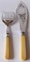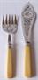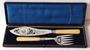 Stříbřený kov, galalit nebo parkesin. Rukojeti oválného, hranolovitého tvaru - z umělé hmoty ( galalit či parkesin ) . Servírovací vidlice s pěti hroty, zdobená prořezávaným a gravírovaným ornamentem. Velký porcovací nůž, zakončený špicí. Zdobený dekorativním prořezávaným a gravírovaným ornamentem. Ve střední části , reliéfní zdobený prstenec. Originální tmavá krabička, uvnitř s modrou látkou a sametem. Evropa 1880 - 1920. Délka nože 31 cm, délka vidlice 24,5 cm. Rozměr etue 35 x 11 cm.