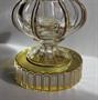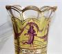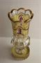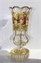 Váza antikizujícího tvaru, kráterovitého těla na noze s těžkou patkou, z čirého skla. Horní okraj zabroušen do 8 oblouků, kráter zabroušen do 8 ploch, noha kanelovaná. Na hrdle vlys bohyň s girlandami růží, malovaný fialově na žluté lazuře, pod ním pás zlatých květinových ornamentů. Bohaté zlacení okrajů, neotřelé. Náročná kombinace brusu, lazury, malby a zlacení. Kol 1925. Výška 21,6 cm, horní okraj průměr 10 cm, podstava průměr 8,7 cm.