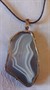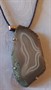 Přívěšek s achátem má rámeček puncovaný platným českým puncem pro stříbro 925/1000, váží 11,50 gramů, měří 5 x 2,5 cm. Achát patří mezi polodrahokamy. Není to pouze jeden minerál, ale směs proužků křemene, chalcedonu a opálu. Pestrá kresba a vysoký lesk achátu probouzejí i dnes fantazii. Vytvářejí podobu motýlů, květin, leštěnými acháty vykládají skříňky, desky stolů, z achátů se vyrábějí náhrdelníky, brože, přívěšky a jsou zasazovány do prstenů.Achát v léčitelství podporuje vážnost, pevnost a vyrovnanost. Pomáhá rozpouštět záporné emoce a chrání vnitřní podstatu člověka. Přívěšek lze nosit na stříbrném řetízku, na kůžiu nebo i na sametové stužce.