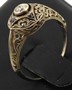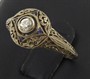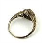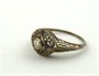 Osmnáctikarátové bílé zlato, přírodní diamant o váze 0,15 ct, čtyři přírodní malé safíry. Ryzost Au 750/1000, celková hmotnost 1,85 g. Prsten z bílého osmnáctikarátového zlata s centrálním přírodním diamantem starého briliantového brusu o váze 0,15 ct, barva I, čistota SI3 a čtyřmi malými přírodními safírky. Mistrovská šperkařská práce s jemně prořezávanými ornamenty. Značeno: československý punc kohout. Evropa, kolem roku 1900. Velikost 56.