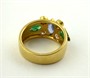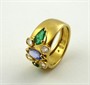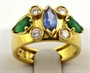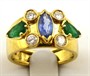 Osmnáctikarátové žluté zlato, přírodní smaragdy, přírodní safír a přírodní diamanty o celkové váze 0,45 ct. Ryzost Au 750/1000, celková hmotnost 6,93 g. Krásný designový prsten italské provenience se čtyřmi přírodními diamanty moderního briliantového brusu o celkové váze 0,45 ct, barva G, čistota SI2, dvěma přírodními smaragdy a jedním přírodním safírem. Prsten z osmnáctikarátového zlata s centrálním přírodním modrým safírem ručně broušeným do tvaru markýz, jehož po stranách doplňují dva přírodní zelené smaragdy výbrusu pendlok, okolo doplněné čtveřicí přírodních diamantů kulatého briliantového tvaru. Prsten se nalézá ve vynikajícím stavu. Značeno: československý punc kohout, ryzost 750 a značka klenotnického mistra. Itálie, třetí třetina minulého století. Velikost prstenu 54.