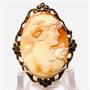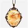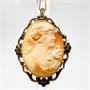 Sbírková, prvorepubliková brož, jež může být užívána jako závěs. Dominantou šperku je kamej vyřezaná z mušloviny, zasazená do půvabného rámečku, netypicky osazen poměrně velkými markazity. Brož ze zlata ryzosti 585/1000, o celkové váze 8,86 g. Rozměry 5 x 3,7 cm. Značeno autentickým puncem - lvíček. Řetízek není součástí prodeje.