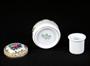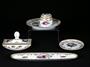 dámská stolní psací souprava značky Rosenthal, 4 kusy - kalamář s podmiskou, miska na pera, miska na drobnosti a kolíbka na vysoušení inkoustu, výroční značení k 50. výročí vzniku porcelánky, Německo 1929; délka misky na pera 24,5 cm, výška vysoušecí kolíbky 6,5 cm; sběratelsky zajímavé