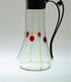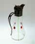 Krásná secesní konvička v půvabném tvarosloví z období Belle Époque kolem roku 1900 z čirého skla s ornamentem z rubínového a zeleného skla a je osazená kovovou montáží se stylově tvarovaným ouškem a odklápěcím víčkem. Čtyři nálepy z rubínového skla imitují polodrahokamy a jsou zušlechtěné brusem. Provedly šumavské, nebo severočeské krystalerie. Dobrý stav, rozměr - v. 19 x 11 x 9cm