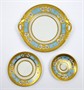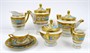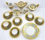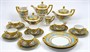 Bílý, barevně ručně malovaný a zlacený porcelán. V neoklasicistním stylu. Bílý porcelán s modrým pásem od porcelánky Slavkov (Schlagenwald). Barevně ručně malovaný květinový dekor a zlacení od firmy Fritz Treuer, Haus-Astoria, Karlovy Vary. Kompletní servis na kávu a čaj čítající 19 ks: šest šálků s podšálky, kávovou konvici, čajovou konvici, konvici na mléko, konvičku na smetanu , cukřenku, šest dezertních talířků a dva podnosy. Značeno zespodu: FRITZ TREUER, KARLSBAD, HAUS-ASTORIA, tištěnou značkou Schlagenwald a ručně psaným nápisem Handgemalt, echt Gold (ručně malováno, pravé zlato). Československo, Slavkov a Karlovy Vary. Výška šálků 6 cm, průměr podšálků 15 cm, výška kávové konvice 24 cm, výška čajové konvice 20 cm, výška konvice na mléko 19 cm, výška konvičky na smetanu 12 cm, průměr dezertních talířků 18,5 cm, průměr obou podnosů 30 cm.