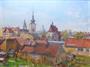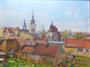 Olej na plátně 46 x 60 cm. Signováno vpravo dole. Pohled na střechy ve městě Pelhřimov s kostelními věžemi, zahrádkou a schnoucím prádlem. Originální zlatý patinovaný rám s reliéfním povrchem. Československo 1930 - 1950. Celkový rozměr s rámem 59 x 73 cm.