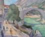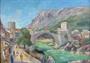 Olej na kartonu 46x65 cm. Signováno vpravo dole s datací 1932 a názvem místa: Mostar. Pohled na starobylý most a město Mostar s místními obyvateli na ulici. Originální stříbrný patinovaný rám s vnitřními barevnými linkami. Československo nebo Bosna Hercegovina rok 1932. Celkový rozměr s rámem 62x80 cm. Richard Uherek - (1900-1974).