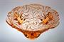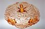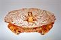 Vzácné barevné provedení mísy, která je známá ve variantě z čirého ručně lisovaného skla. Rosalinová mísa otevřeného tvaru s hlubokým reliéfem lístků a květů, které drží stylizovaně pohromadě tři trpaslíci a jejich zadečky jsou zároveň nožičky mísy. Efektní a vtipně pojatá mísa s figurálním dekorem ze 30-40tých let. Dobrý stav, rozměr prům. 27cm, v. 9cm