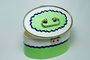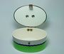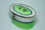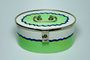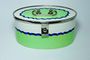 Oválná porcelánová dóza v kovové chromované montáži dekorovaná geometrickým ornamentem, který odděluje plochu do dvou barev - bílé a zelené. Montáž je doplněna elegantním ouškem a zámečkem. Velmi dekorativní a vhodné i na praktické požívání. Značeno vespod vtlačeným číslem a razítkem, dobrý stav, rozměr - š. 22 x 16 x 10cm