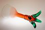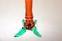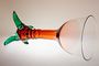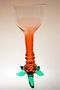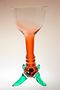 Designová autorská váza otevřeného tvaru z rubínového skla, které přechází v čiré, vespod se zelenými nálepy a tři jsou pojaté jako nožky na nichž váza netypicky a stabilně stojí. Autor návrhu Bořek Šípek a provedla sklárna AJETO po roce 2000. Perfekt stav bez poškození, rozměr - v. 34cm, prům. 14,5cm