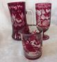 Soubor tří skleněných předmětů je výrobkem sklárny Egermann v Novém Boru. Džbánek s uchem a číše na noze jsou ručně broušené a mají lovecké motivy. Poslední nízká číše je nejstarší a je ručně malovaná.Džbánek je vysoký 16 cm, číše na noze je vysoká 15,5 cm, nejmenší číše měří na výšku 9,5 cm. Všechny tři předměty jsou zcela nepoškozené.Sklárna Egermann se nachází ve městě Nový Bor v severních Čechách. Název pochází od slavného sklářského technologa a malíře skla, Friedricha Egermanna, , který se malbě naučil v německém Míšni. Po návratu do Nového Boru se věnoval malbě na sklo a svůj čas věnoval experimentování s novými technikami zdobení. Společnost Egermann, jejíž vznik se datuje na počátek 18. století, se stále specializuje na ručně zdobené sklo. Egermannovým hlavním a nejproslulejším vynálezem z roce 1832, je proces „červené barvení“, kdy rubínově červené zbarvení na povrchu každého kusu je zdobeno barokními vzory pomocí brousících a gravírovacích postupů.