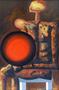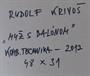 Olej s kombinovanou technikou na kartonu 48 cm x 31 cm. Ve stylu informel. Signováno vpravo dole s datací 2012. Vzadu na kartonu přípis autora s názvem díla, technikou, rozměrem a datací. Autor obrazu: Rudolf Krivoš (1935-2020). Název ve slovenštině: Muž s balónom. Stylizovaná sedící postava muže s červeným balónem na klíně. Malba doplněná zrnky písku nanášenými do barevné hmoty tvořícími reliéfní texturu. Černý rám se zlatou vložkou. Slovensko, rok 2012. Celkový rozměr s rámem 76,5 cm x 53,5 cm.